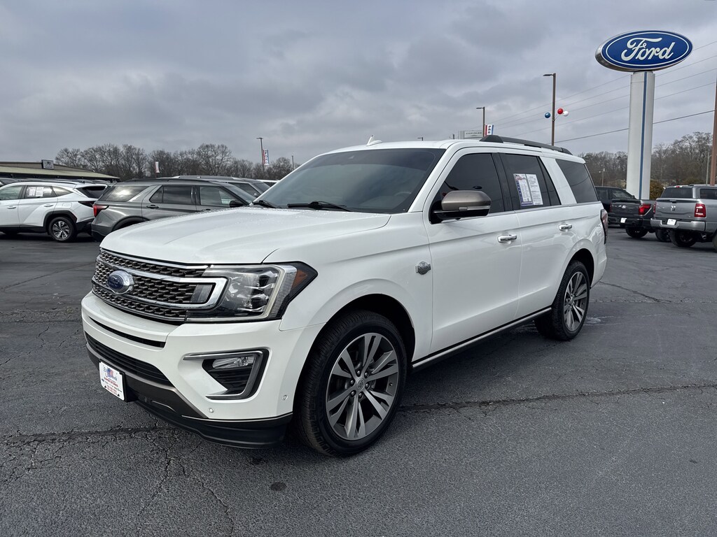 Certified. White 2021 Ford Expedition King Ranch RWD 10-Speed Automatic EcoBoost 3.5L V6 GTDi DOHC 24V Twin Turbocharged 12 Speakers, 4-Wheel Disc Brakes, ABS brakes, Air Conditioning, AM/FM radio: SiriusXM, Automatic temperature control, Dual front impact airbags, Dual front side impact airbags, Emergency communication system: SYNC 3 911 Assist, Equipment Group 400A Standard Package, Four wheel independent suspension, Front anti-roll bar, Front dual zone A/C, Garage door transmitter, Genuine wood console insert, Genuine wood dashboard insert, Genuine wood door panel insert, Heated steering wheel, Heated/Ventilated Del Rio Lthr Fr Captain's Chairs, Low tire pressure warning, Navigation System, Occupant sensing airbag, Power moonroof, Radio data system, Radio: B&O Sound System by Bang & Olufsen, Rear air conditioning, Rear audio controls, Rear window defroster, SiriusXM Satellite Radio, Speed-sensing steering, SYNC 3 Communications & Entertainment System, Traction control.